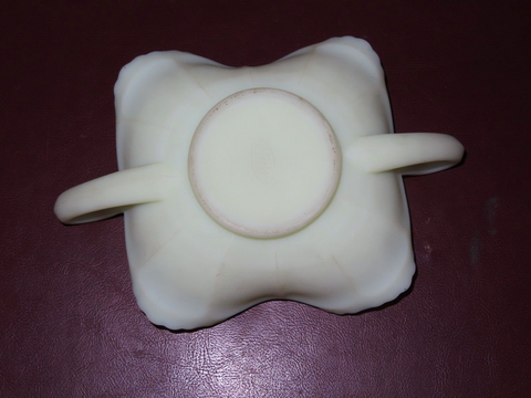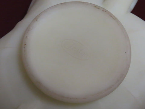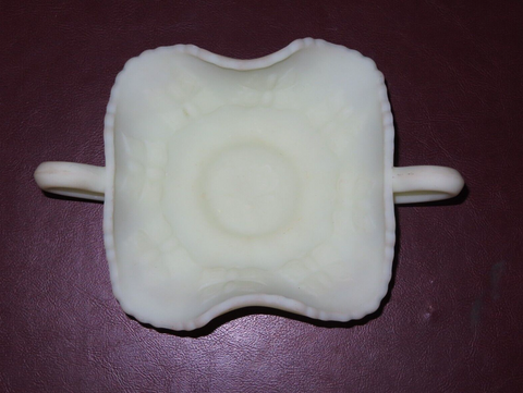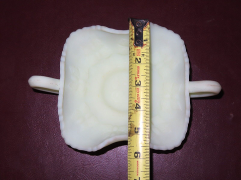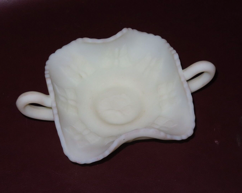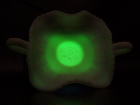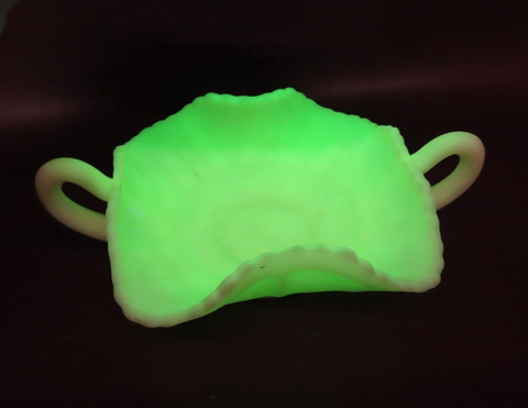 Vintage Fenton White Green Double Handle Vaseline Uranium Glass Dish w/ Scalloped & Ruffled Lip & Butterfly Decor